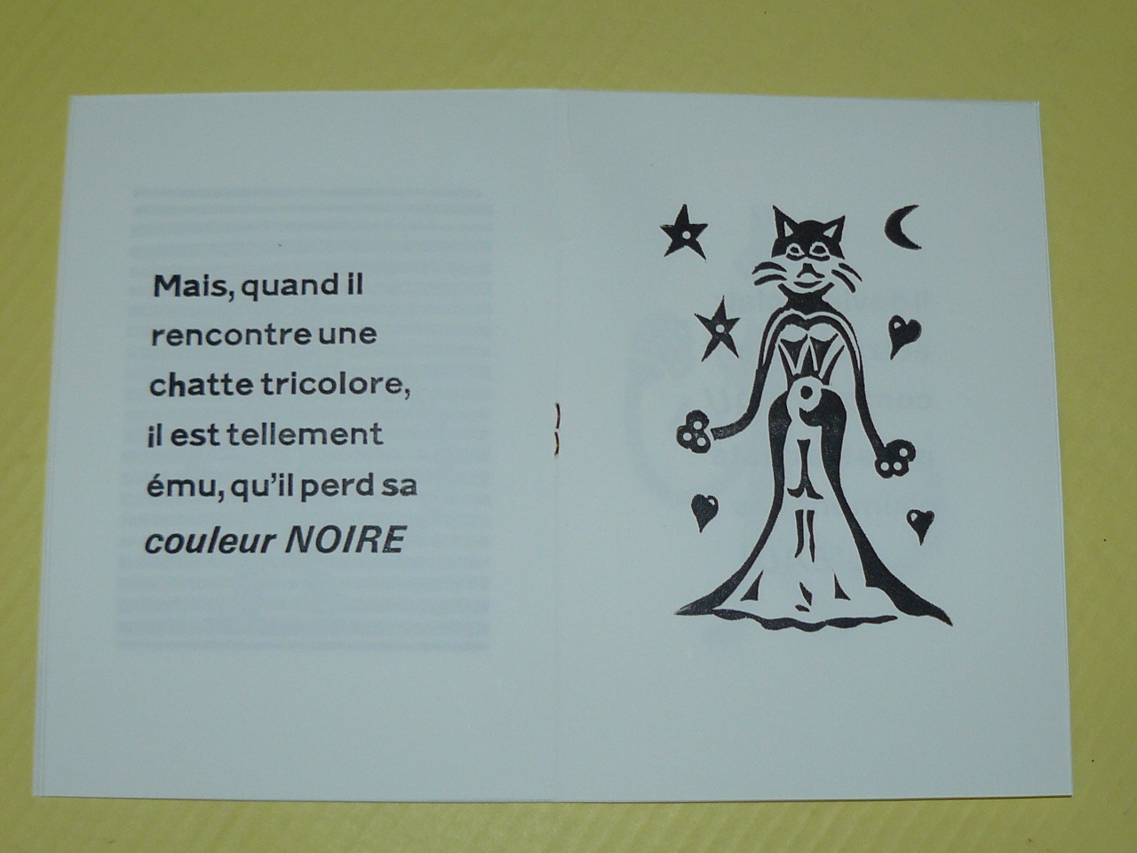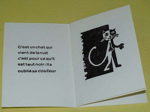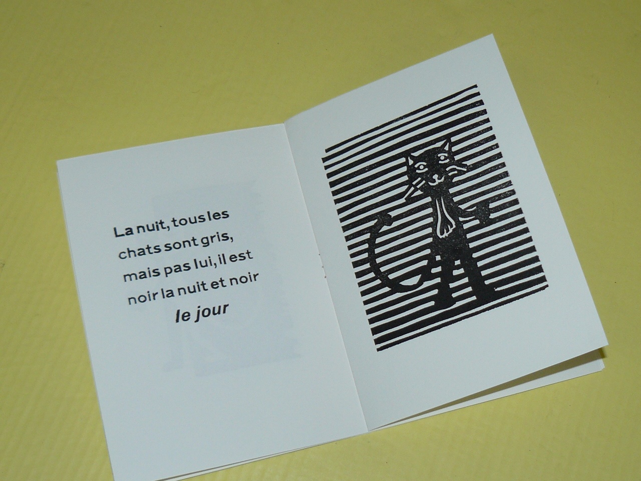 1. c’est un gros boulot, entre les linos, les typos et la mise en page… sans se tromper ni de sens ni d’ordre, je dis chapeau ! j’aime bien cette simplicité des mots et des traits, on a envie de continuer les aventures du chat noir