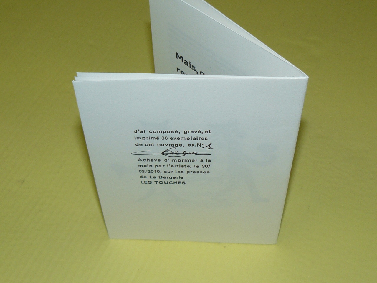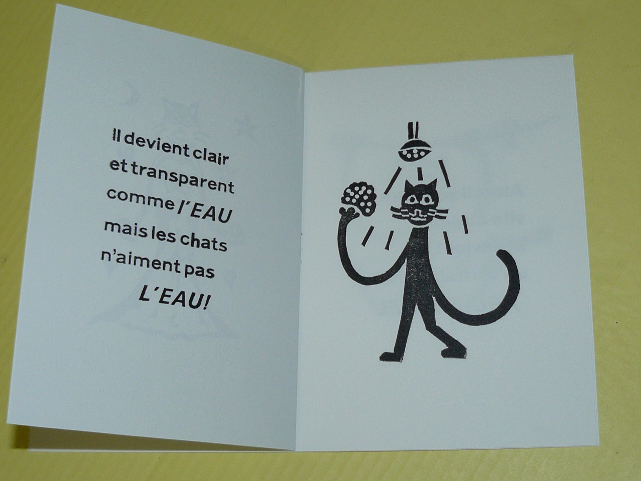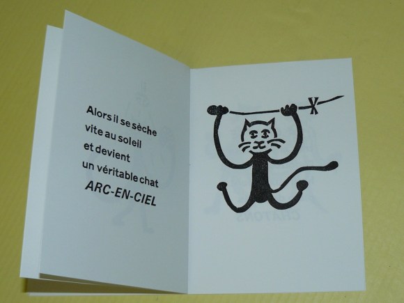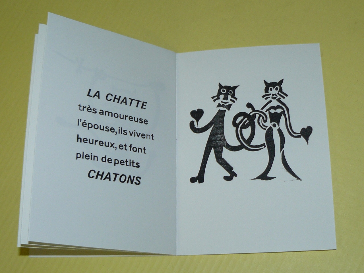 1. c’est un gros boulot, entre les linos, les typos et la mise en page… sans se tromper ni de sens ni d’ordre, je dis chapeau ! j’aime bien cette simplicité des mots et des traits, on a envie de continuer les aventures du chat noir