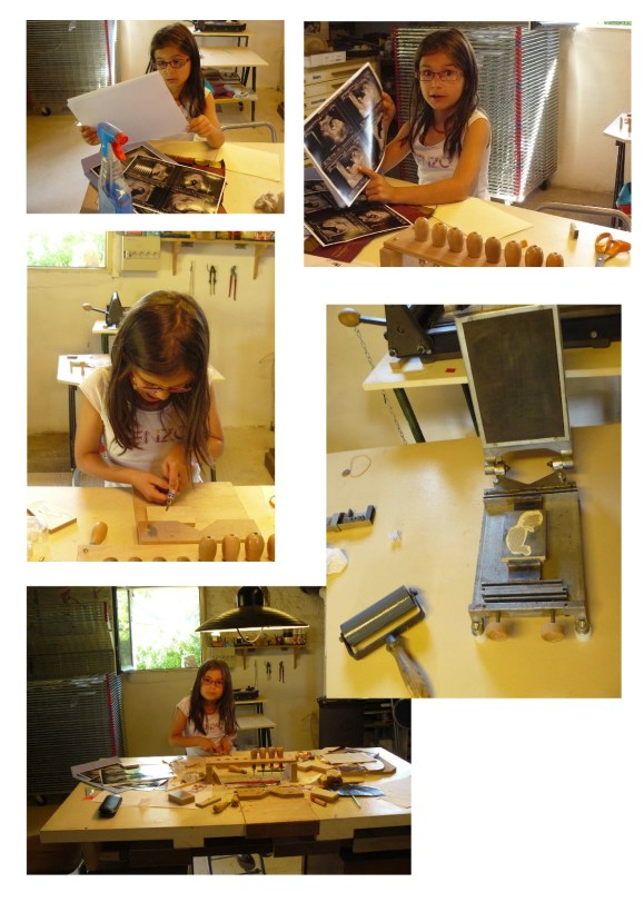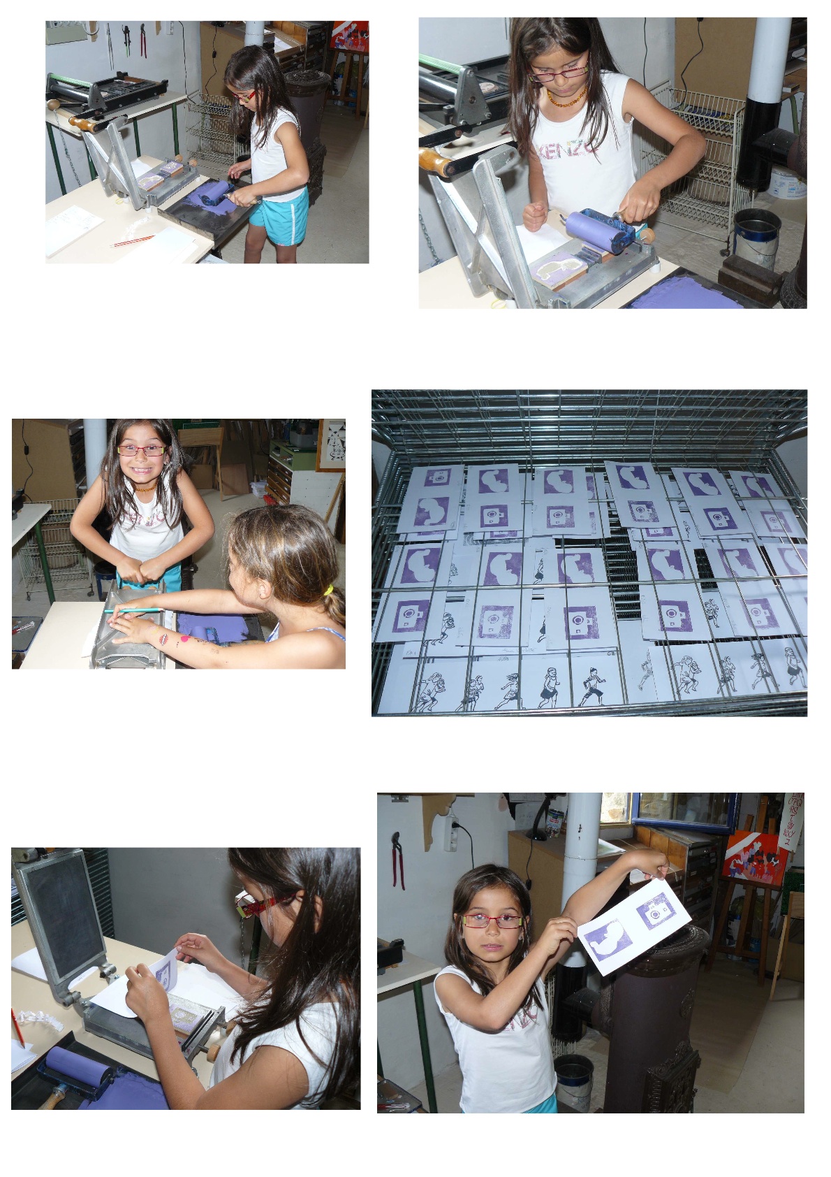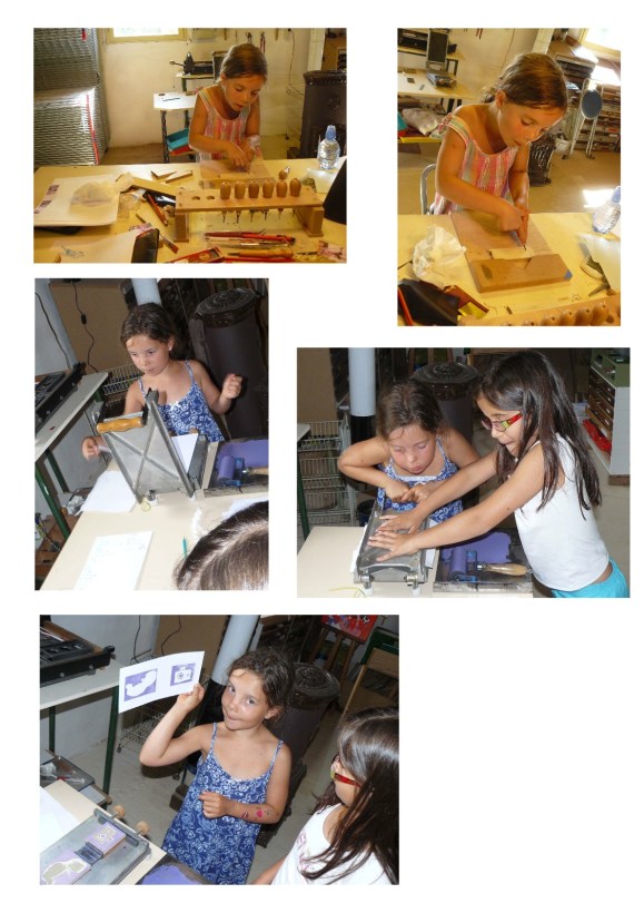 Mes petites artistes gravent et impriment de concert à la Bergerie :
