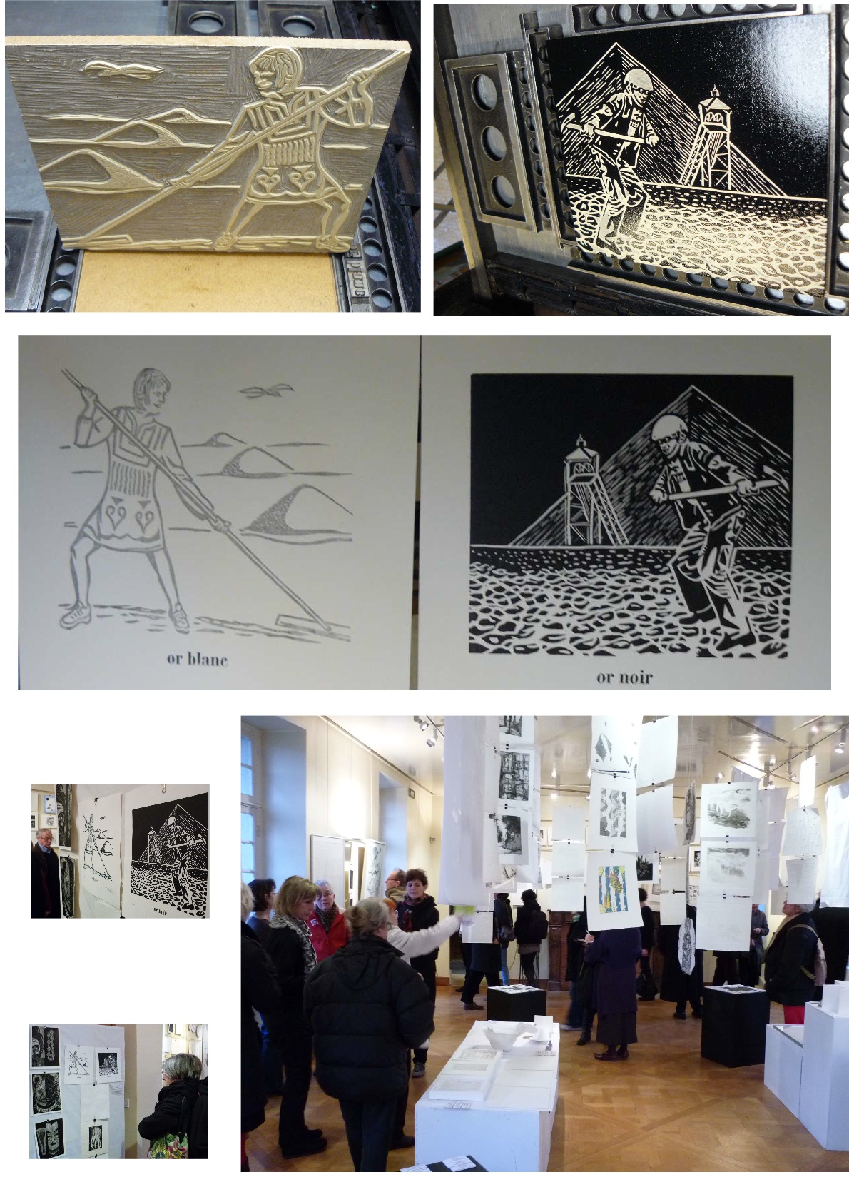 J’ai travaillé le bois professionnellement pendant presque 20 ans, j’ai enseigné pendant plus de 10 ans, j’ai été artisan d’art, j’ai fait de la toute petite série, et je retrouve tout cela mélangé dans la lino : le matériau est gravé, coupé, scié, mis à hauteur, et les gravures sont éditées en toute petite série, puisque le procédé est depuis tout temps lié au multiple.