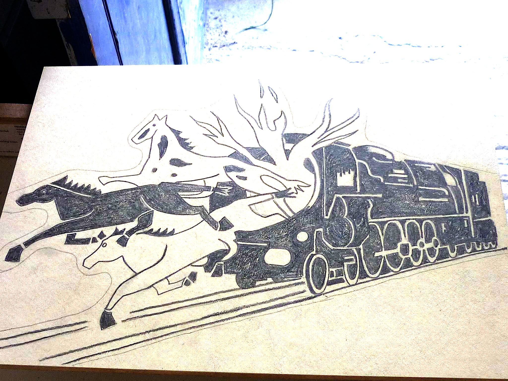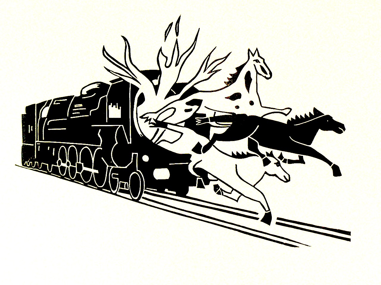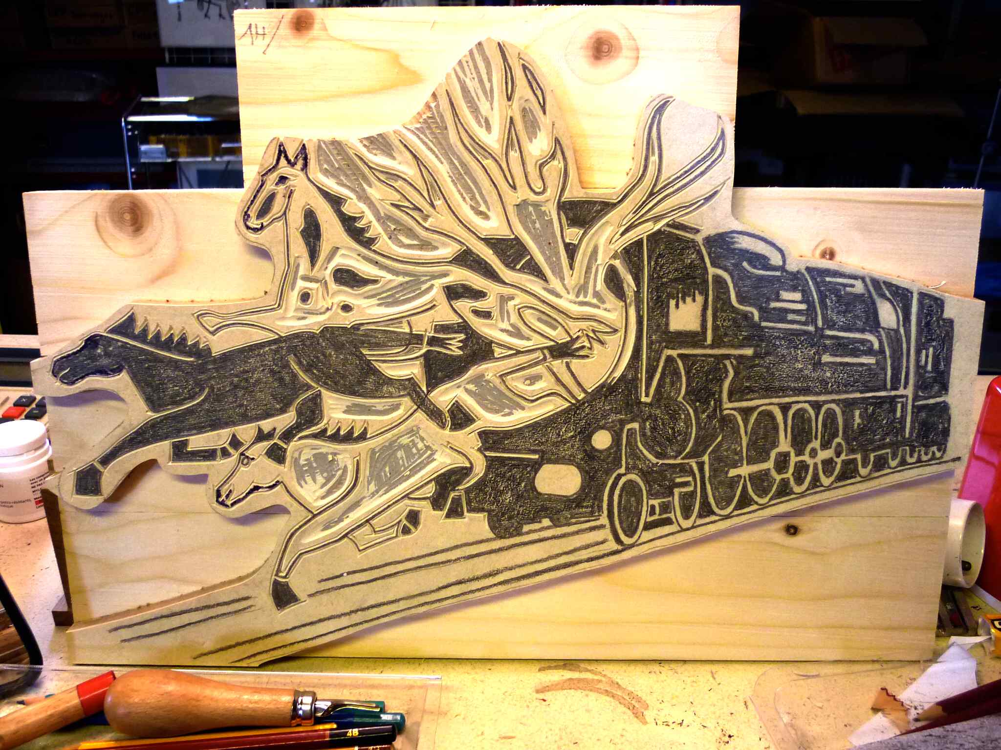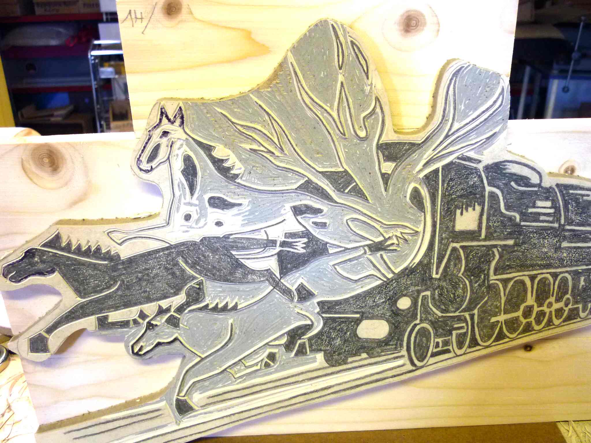 J’avais appelé ma nouvelle gravure « les chevaux de feu », mais tout en gravant, et maintenant en l’imprimant, je reviens vers ce titre, et le change en « échappement libre ». Il correspond mieux à tout ce que j’ai ressenti en préparant, dessinant, découpant mes dessins, les collant ensemble, et re-dessinant tout : cet échappée belle vers la liberté, cet échappement dans les flammes hors de la technique !