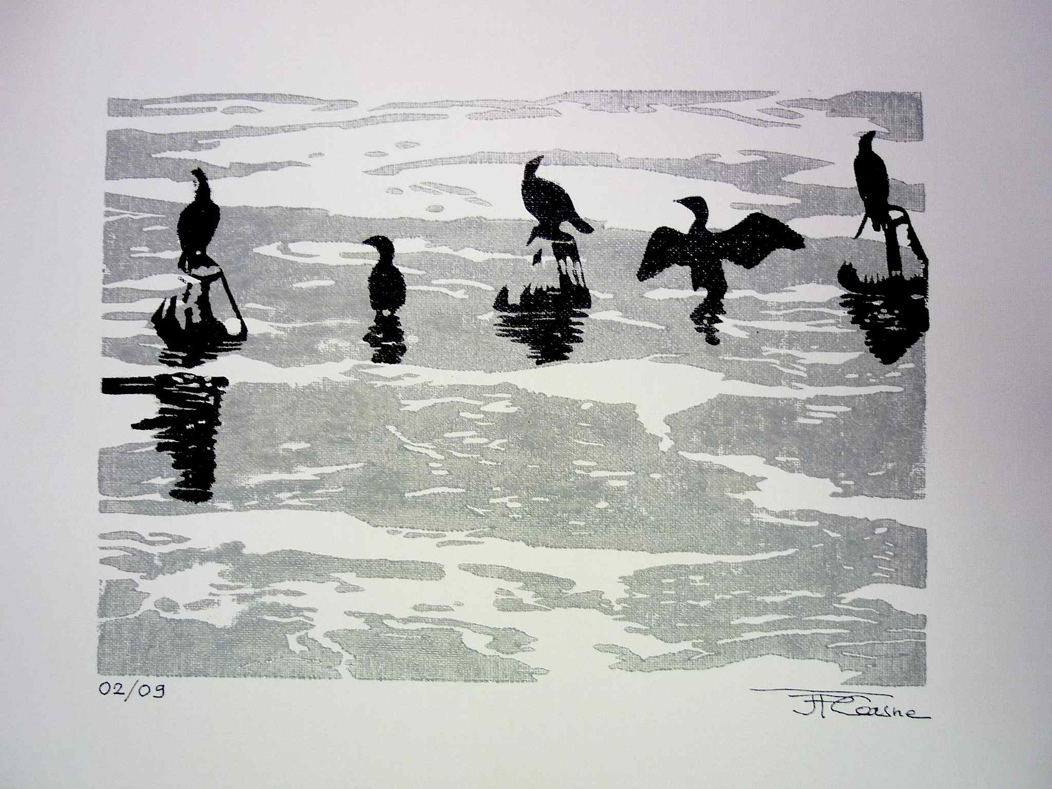 Alors j’ai essayé le carton entoilé : assez dur lui aussi, avec en plus le grain de la toile, ses creux et ses bosses. À condition d’accepter que le grain de la toile transparaisse, le résultat est intéressant : j’ai poussé l’exercice très loin, en imprimant d’abord un fond d’image bien chargé, et une fois sec, le motif de premier plan au dessus, en repérage visuel, et voilà :
