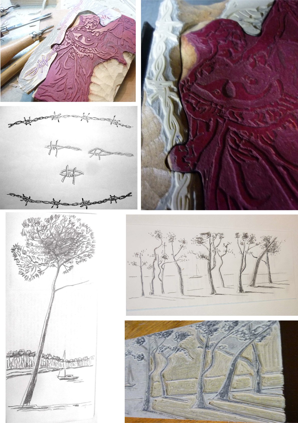 Donc, j’étais parti sur le barbelé … En impression directe, ou en le gravant. J’ai continué à expérimenter : du barbelé lié sur une plaque de contreplaqué, du barbelé martelé, pour avoir une empreinte plus large, mais il casse systématiquement, et du barbelé gravé. La dernière solution est réaliste (même trop …) mais le dessin est trop gros, alors je l’ai affiné, et aussi j’ai réduit une gravure au pantographe !