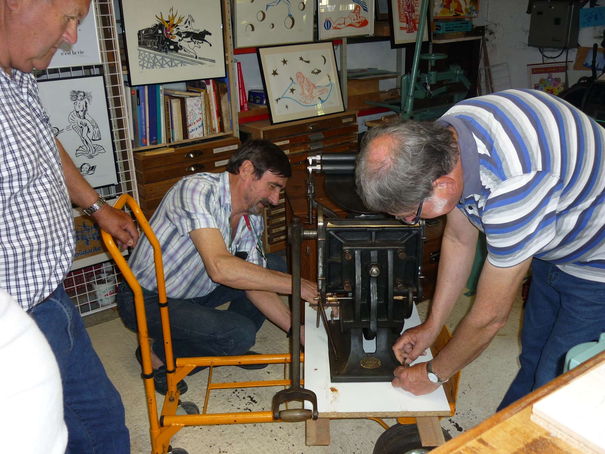 Une presse Gutenberg en visite à l’atelier de linogravure pour la fête de l’estampe.