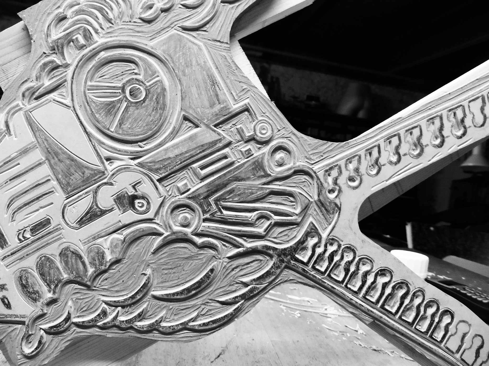 Après avoir dessiné, gommé, redessiné, j’ai commencé la gravure, c’est coton, entre la loco, les dents de la fermeture, et le gros curseur que j’ai greffé à la loco, il y a du boulot !