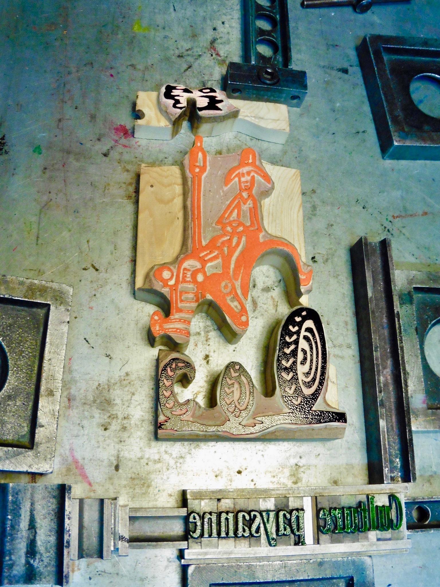 À la fin j’obtiens trois morceaux, les roues, le corps du tracteur et la petite fumée : chacun va être encré séparément, puis assemblé avec les autres, et l’ensemble fixé dans la presse avant d’être imprimé. Voilà, c’est fini, il reste le séchage.