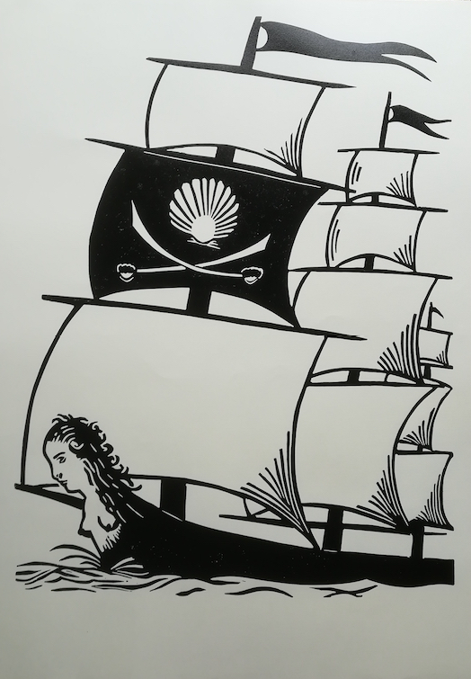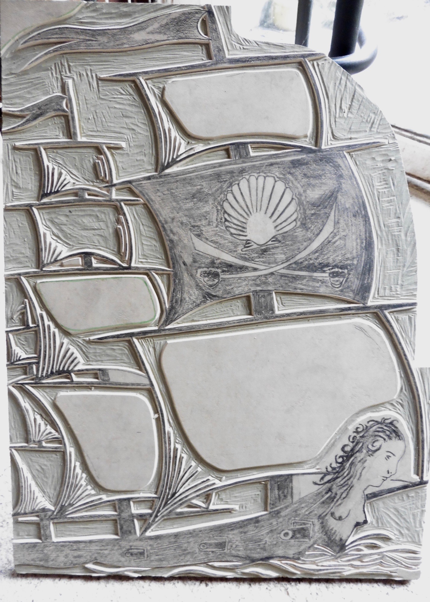 Alors, après des heures de gravure, aujourd’hui, c’est le moment attendu de l’impression du trois mâts que j’ai choisi en fond d’affiche ! Il mêle mes souvenirs d’enfance, mes lectures, et mon imaginaire actuel :