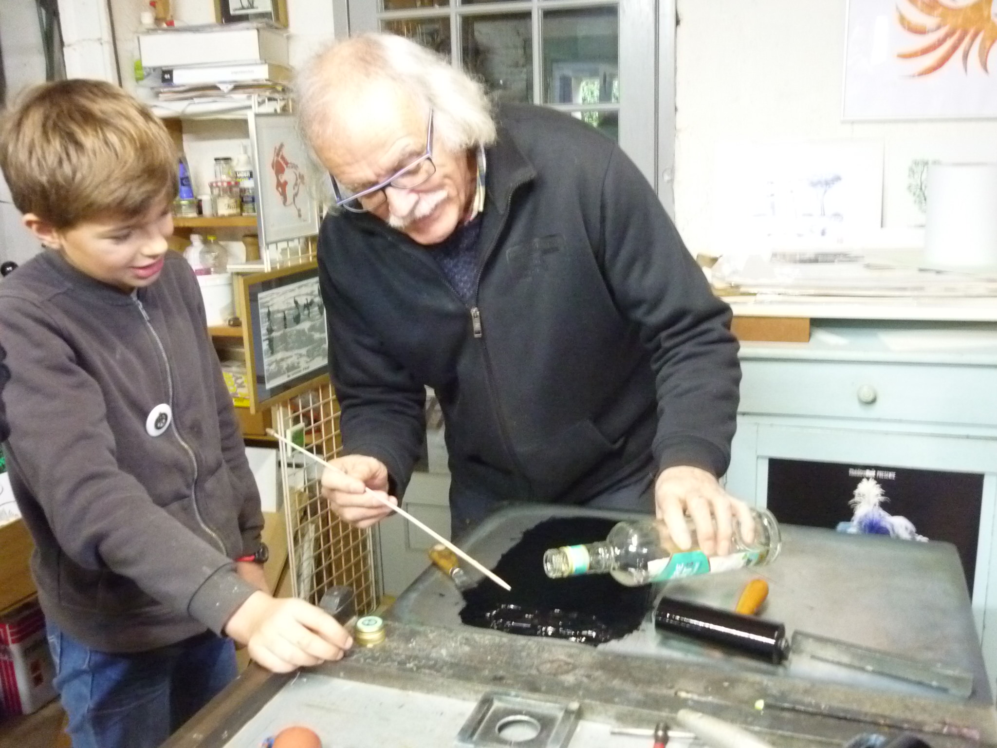 J’avais calé ma plaque : le trois mâts de Julienne David, notre « mascotte » de 2019, et une fois l’encre noire préparée, on a commencé.