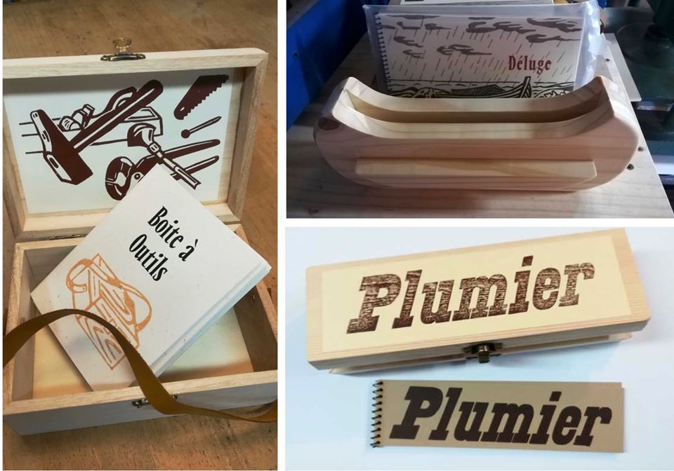 Dans une semaine exactement, au salon Anima Libri à Montreuil Bellay ! j’y présente mes dernières créations : livres-boîtes comme « Plumier », « Boîte à outils », « Déluge », mes linogravures sur le thème de mes boîtes, et celui des livres. Et des « vieilleries » ! c’est-à-dire des boîtes-jeux réalisées quand j’étais artisan d’art en jeux et jouets, et qui dormaient gentiment au grenier…
