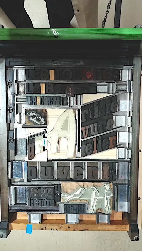 J’ai fini de graver la première version de la plaque : je vais pratiquer la technique de la plaque perdue. Je commence par enlever tous les « blancs » et ensuite j’imprime avec la couleur la plus claire. Ici ce sera le gris, et ensuite le noir. Comme je vais utiliser des papiers de différents aspects : blanc pur, ivoire, crème, écru, je vais utiliser le « blanc » du papier pour faire le gris : tout d’abord j’imprime en noir sur un papier brouillon : vieux journaux, papier de rebut, peu importe. Et, sans ré-encrer, j’imprime encore sur papier brouillon jusqu’à ce que le reste d’encre donne un beau gris, et là j’imprime sur le vrai papier.