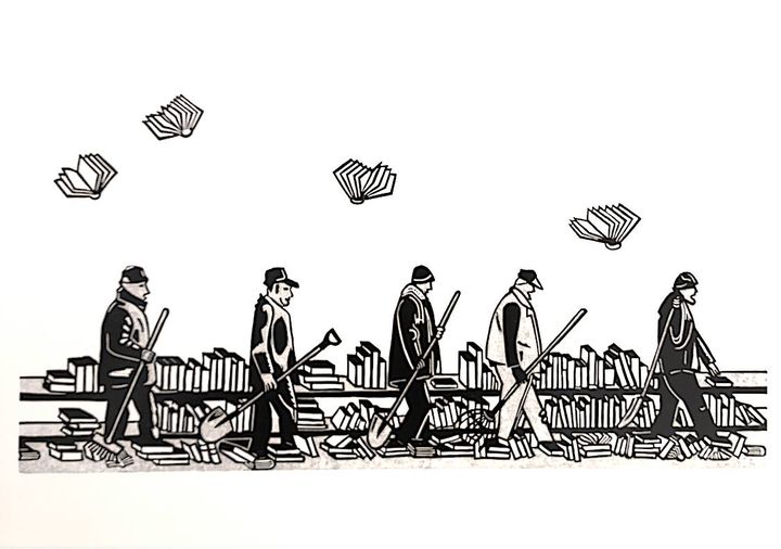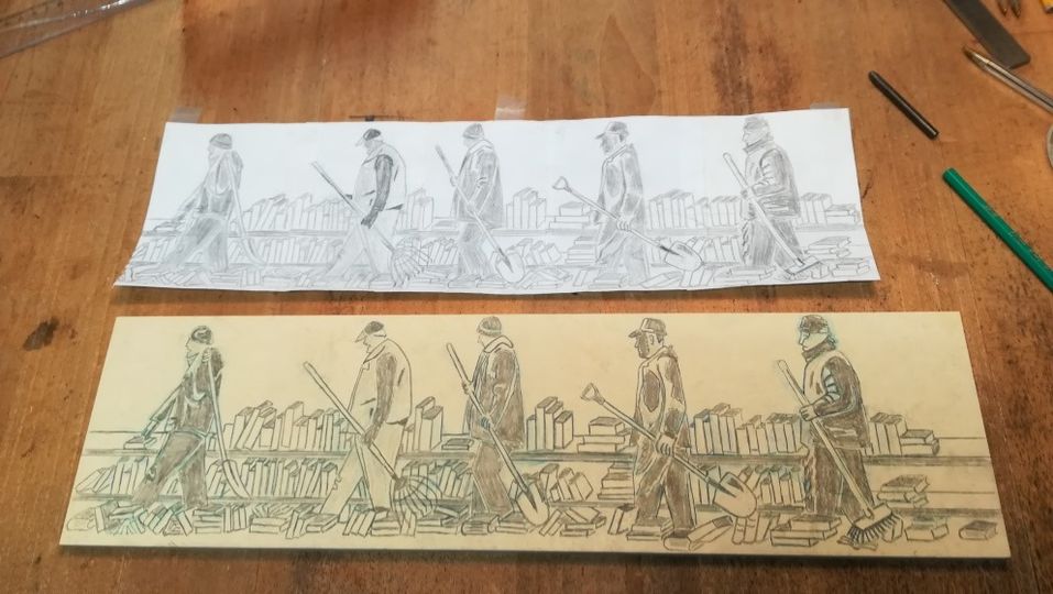 Comme on était bien partis pour un confinement long, je me préparais à graver une longue linogravure : 5 personnages équipés de pelles, râteau, balai, au milieu de près de 160 livres.Avec dans le ciel d’autres livres qui s’envolent. Voici le premier dessin et le report sur la plaque lino de 480/140 mm