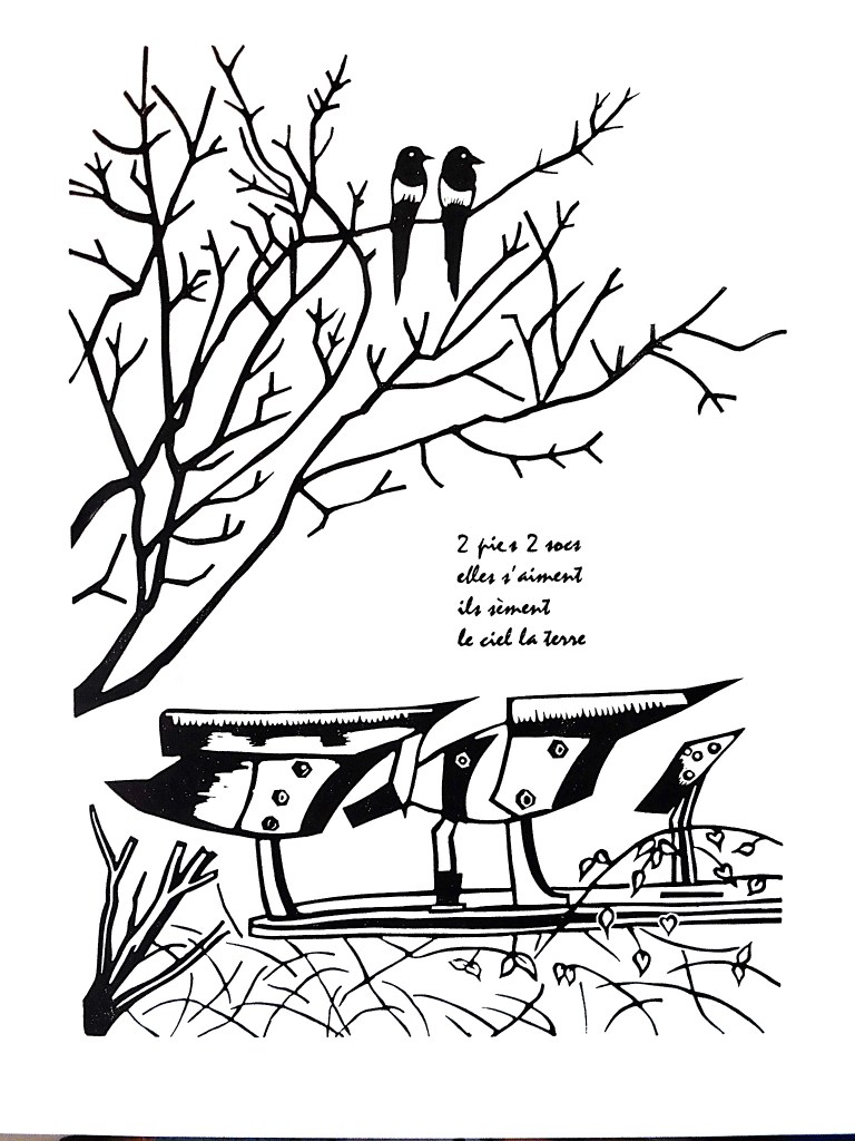 Cet hiver, les pies jacassent, et volent on tous sens. Je suis à l’ordi, et par la fenêtre, je les aperçois, et commence vraiment à m’intéresser à elles. Un couple se pose sur une branche haute du grand chêne : elles se regardent et soudainement, regardent ensemble dans la même direction. Deux pies noires et blanches, les branches enchevêtrées et noires sur le ciel : tout cela est très graphique, une gravure s’imposera forcément, un jour. Mes photos dorment dans un coin de mes pensées. La gravure est en gestation, mais ne naît pas encore ! Il me manque inconsciemment un déclencheur, comme une histoire qui commence, mais dont on ne possède pas la fin … Et c’est au printemps, quand les agriculteurs commencent à labourer que doucement les pies et les charrues s’assemblent dans mon esprit. Et voilà, les deux pies vont rencontrer sur ma gravure les deux socs improbables aujourd’hui d’une charrue d’autrefois. Alors ça va très vite, je dessine, gomme, assemble, découpe et mon projet prend forme. La gravure pourrait être un jeu d’enfant, mais je désire beaucoup de branches autour des pies, et beaucoup d’herbes folles autour des socs. Et dans l’espace laissé libre entre l’arbre et les herbes, un petit poème à la façon des haïkus japonais prend sa place, composé avec une vieille police de caractères un peu usagée.