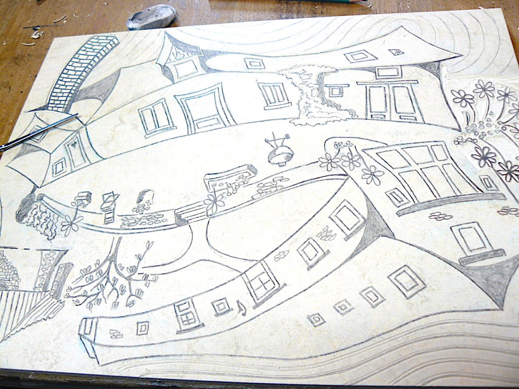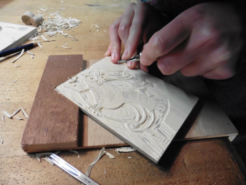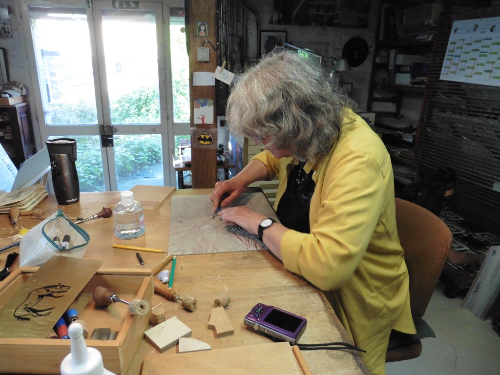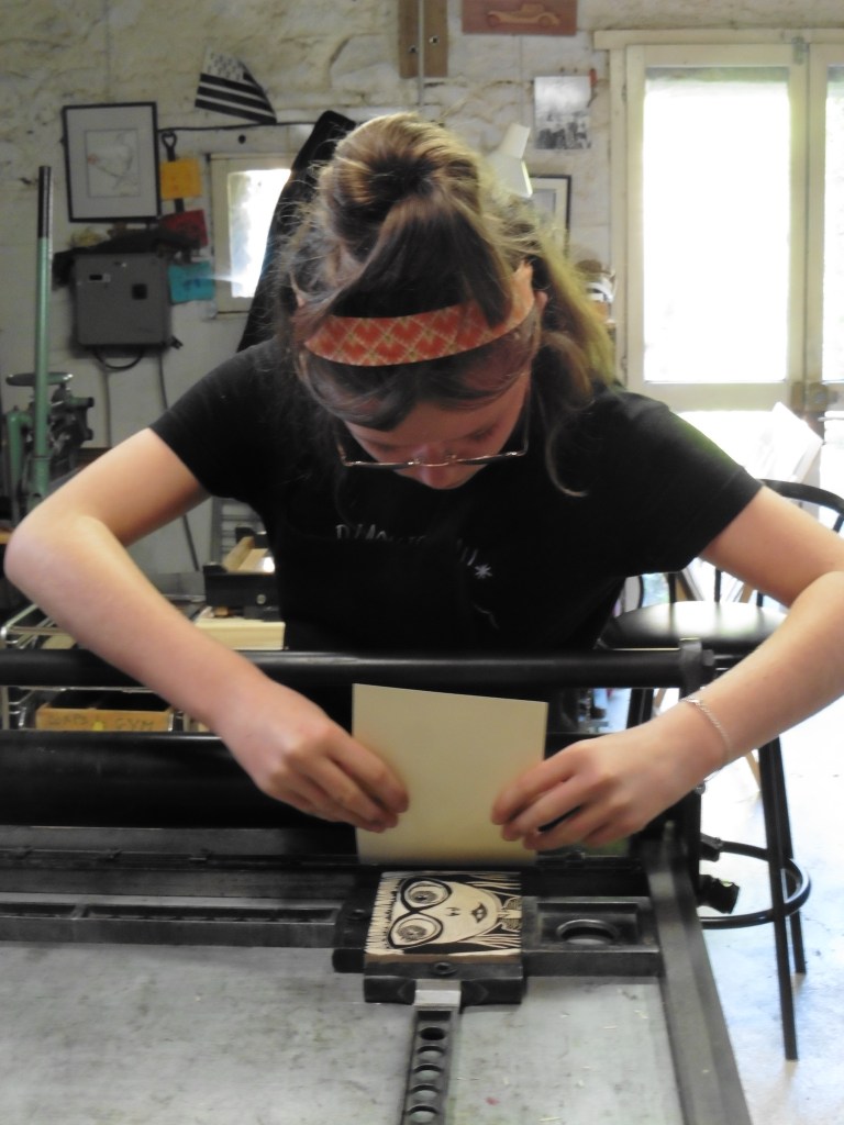 Cet hiver, les pies jacassent, et volent on tous sens. Je suis à l’ordi, et par la fenêtre, je les aperçois, et commence vraiment à m’intéresser à elles. Un couple se pose sur une branche haute du grand chêne : elles se regardent et soudainement, regardent ensemble dans la même direction. Deux pies noires et blanches, les branches enchevêtrées et noires sur le ciel : tout cela est très graphique, une gravure s’imposera forcément, un jour. Mes photos dorment dans un coin de mes pensées. La gravure est en gestation, mais ne naît pas encore ! Il me manque inconsciemment un déclencheur, comme une histoire qui commence, mais dont on ne possède pas la fin … Et c’est au printemps, quand les agriculteurs commencent à labourer que doucement les pies et les charrues s’assemblent dans mon esprit. Et voilà, les deux pies vont rencontrer sur ma gravure les deux socs improbables aujourd’hui d’une charrue d’autrefois. Alors ça va très vite, je dessine, gomme, assemble, découpe et mon projet prend forme. La gravure pourrait être un jeu d’enfant, mais je désire beaucoup de branches autour des pies, et beaucoup d’herbes folles autour des socs. Et dans l’espace laissé libre entre l’arbre et les herbes, un petit poème à la façon des haïkus japonais prend sa place, composé avec une vieille police de caractères un peu usagée.