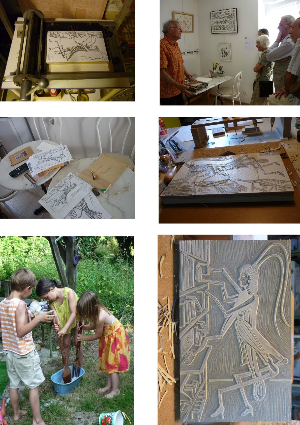 La vie de la Bergerie : lino, presseuse, ateliers d’artistes amateurs, impression de tabliers, exposition