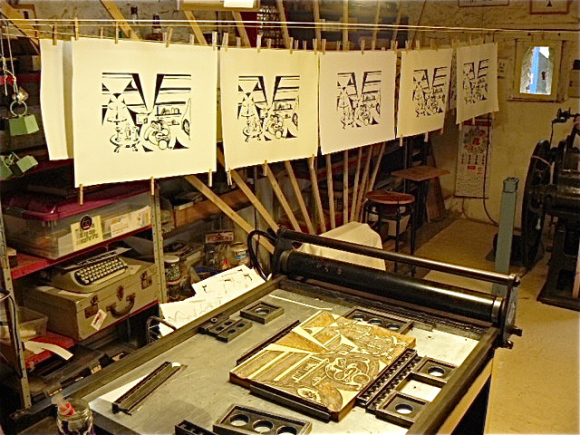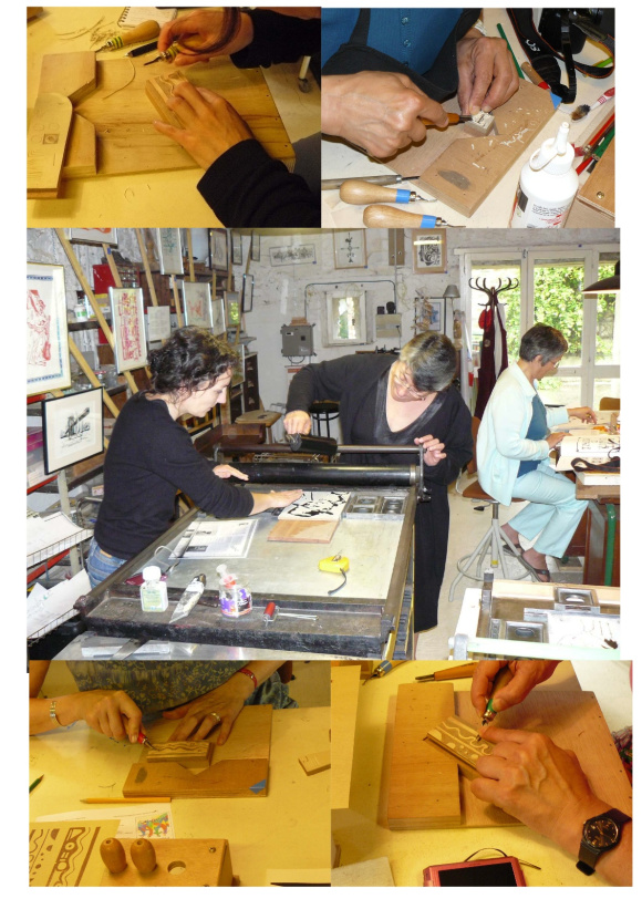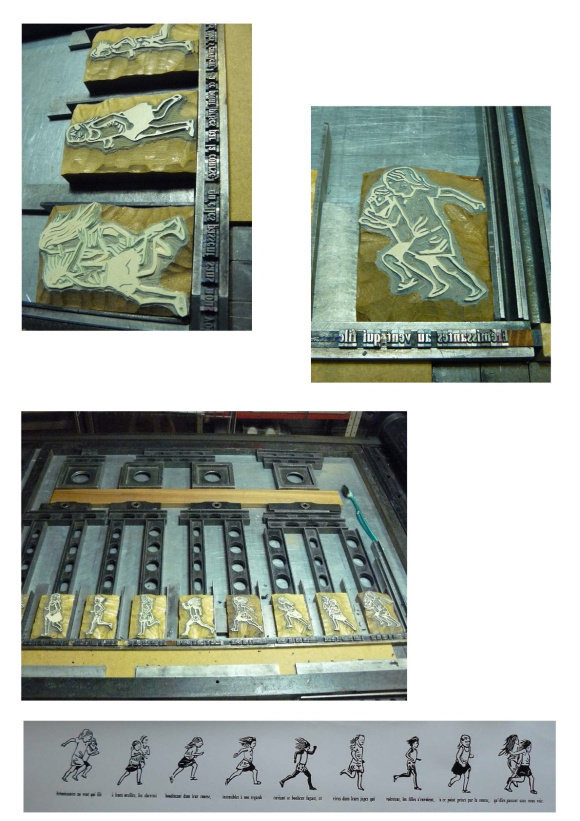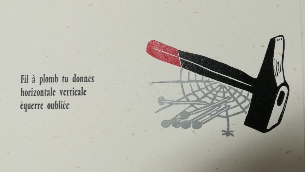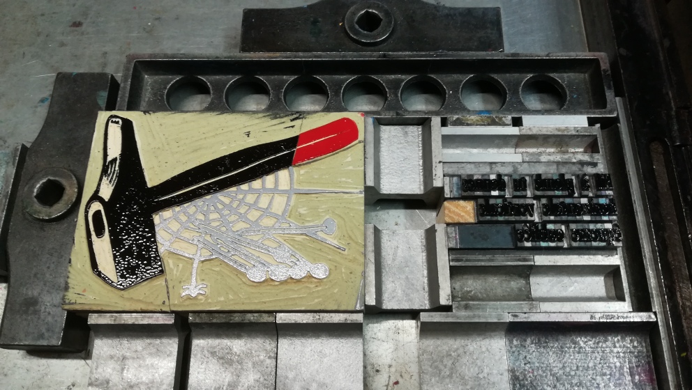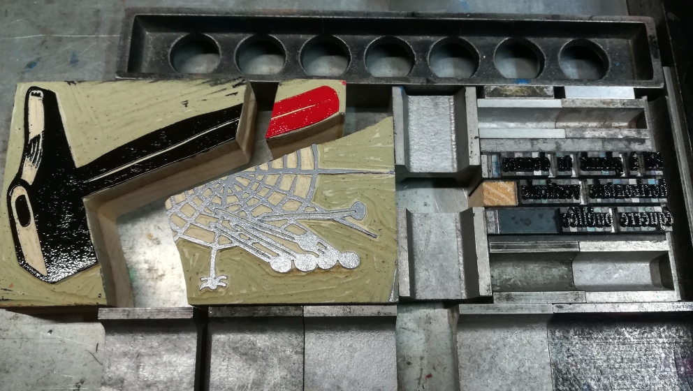 Demain je termine la compo et l’impression des textes, et je commence la gravure des objets, pendant que les pages textes sèchent. J’ai neuf linogravures à réaliser, normalement ça doit coller !