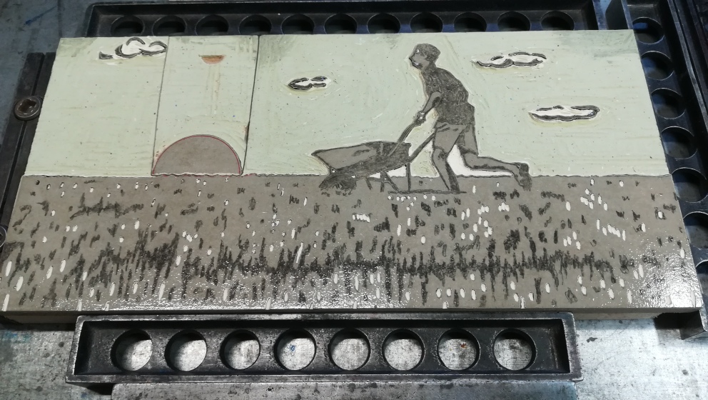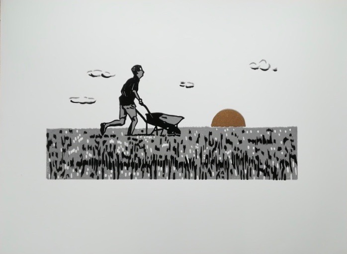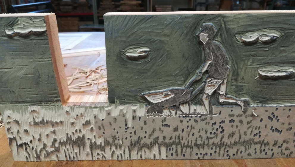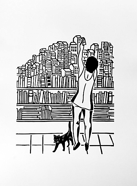 J’ai commencé à graver le désordre, ça demande de l’attention, le désordre : on regarde, on écoute, on y pense et … on trouve. Cette fois, ce sont les livres empilés dans l’une des bibliothèques de la maison, celle qu’on a sous les yeux tout le temps, elle est dans la salle de séjour, on la voit, et là je la regarde, et c’est bien ça, elle est complètement en désordre. Le soleil de l’automne l’éclaire en partie, je vais essayer de rendre l’atmosphère en gravure. Et voilà, après des heures de dessin, gravure, et enfin d’impression, en deux couleurs mêlées.