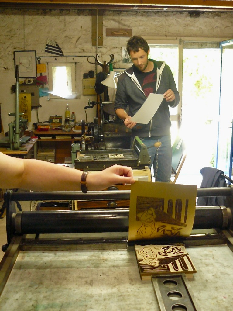 L’atelier de linogravure est installé dans une ancienne étable toute en pierres. Les vaches sont parties depuis plus de cinquante ans, mais je crois que leur âme est toujours là ! Et voilà qu’après des années, ce sont mes gravures qui s’emparent d’elles.