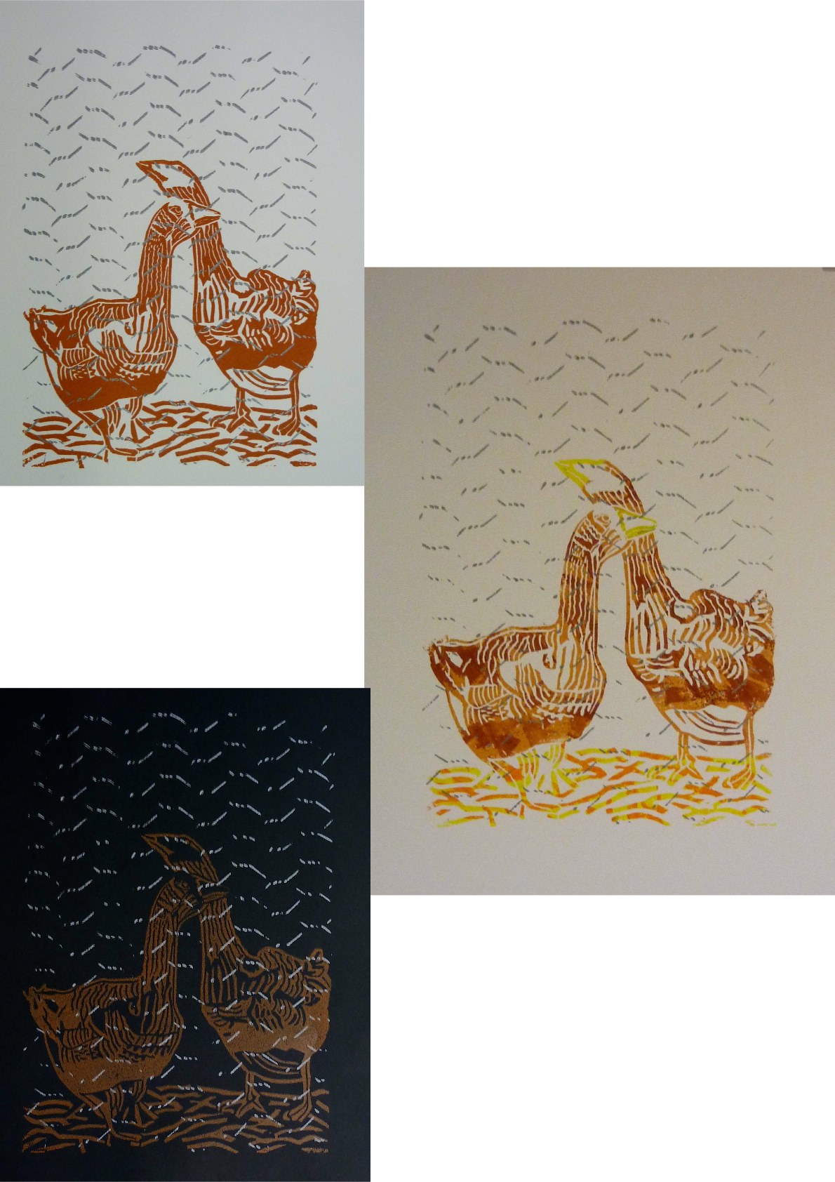 Ensuite, j’ai décidé de séparer les couleurs, comme pour le cerf volant : j’ai dessiné mon idée, afin de partir plus sûrement, et j’ai découpé à la scie à chantourner le lino que j’utilise actuellement : du lino déjà collé sur du médium, ce qui me permet d’avoir une bonne épaisseur à graver, ici c’est important.