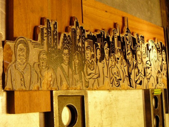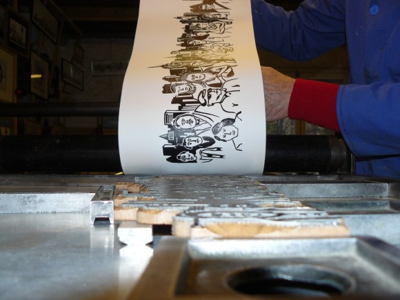 Comme j’ai eu la chance de rencontrer des professionnels de l’imprimerie, quand j’étais professeur de publicité, j’ai noué des contacts et appris aussi beaucoup auprès d’eux. Maintenant que je pratique la gravure, je l’associe à la typographie matérielle : j’utilise des presses typographiques et des caractères en plomb, mais aussi en plastique et en bois, avec les enfants.