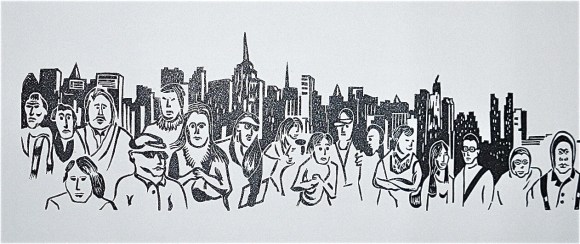 Après avoir gravé des paysages, des images de la ville, j’y ai peu à peu introduit les gens. Ma gravure s’oriente désormais vers la vie, l’humain, le social. J’associe à mes gravures de courts textes, provenant de la vie quotidienne, de mots d’enfants, de réflexions sur notre époque. Pour les fêtes de fin d’année, j’ai réalisé des cartes de voeux en utilisant des personnages gravés, à l’occasion d’animations avec des enfants.