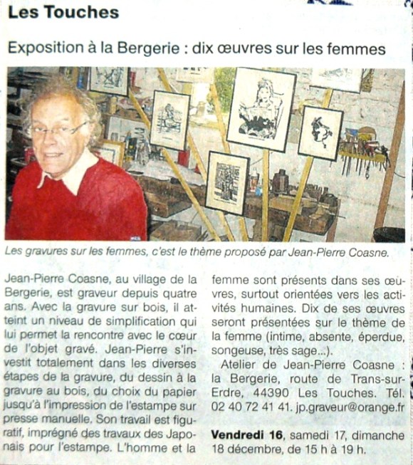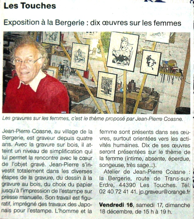 Contact. Atelier de Jean-Pierre Coasne, la Bergerie, route de Trans-sur-Erdre, 44 390 Les Touches ; tél. 02 40 72 41 41 – jp.graveur@orange.fr.